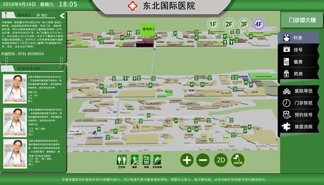 科室介紹、專家介紹、科室3D導航、就診流程、掛號、門診排班、醫院導覽、意見反饋、多語言、觸摸交互、系統數據綜合與分析等;