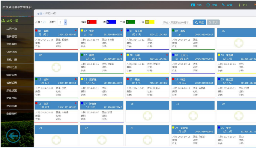 基于 B/S 架構(gòu),支持床位和房間一覽表管理與顯示,支持住院人數(shù)、護(hù)理級別人數(shù) 統(tǒng)計和關(guān)鍵字搜索,可完成入院登記、出院、換床、欠費(fèi)催繳、服藥提醒、二維碼掃描 等日常業(yè)務(wù)。提供床頭、門口、信息看板等圖形用戶界面的在線編輯工具,支持日常呼 叫護(hù)理記錄查詢、導(dǎo)出和錄音回放,具有完善的醫(yī)護(hù)人員排班、病區(qū)公告信息、護(hù)理標(biāo) 識預(yù)警顏色等管理功能。