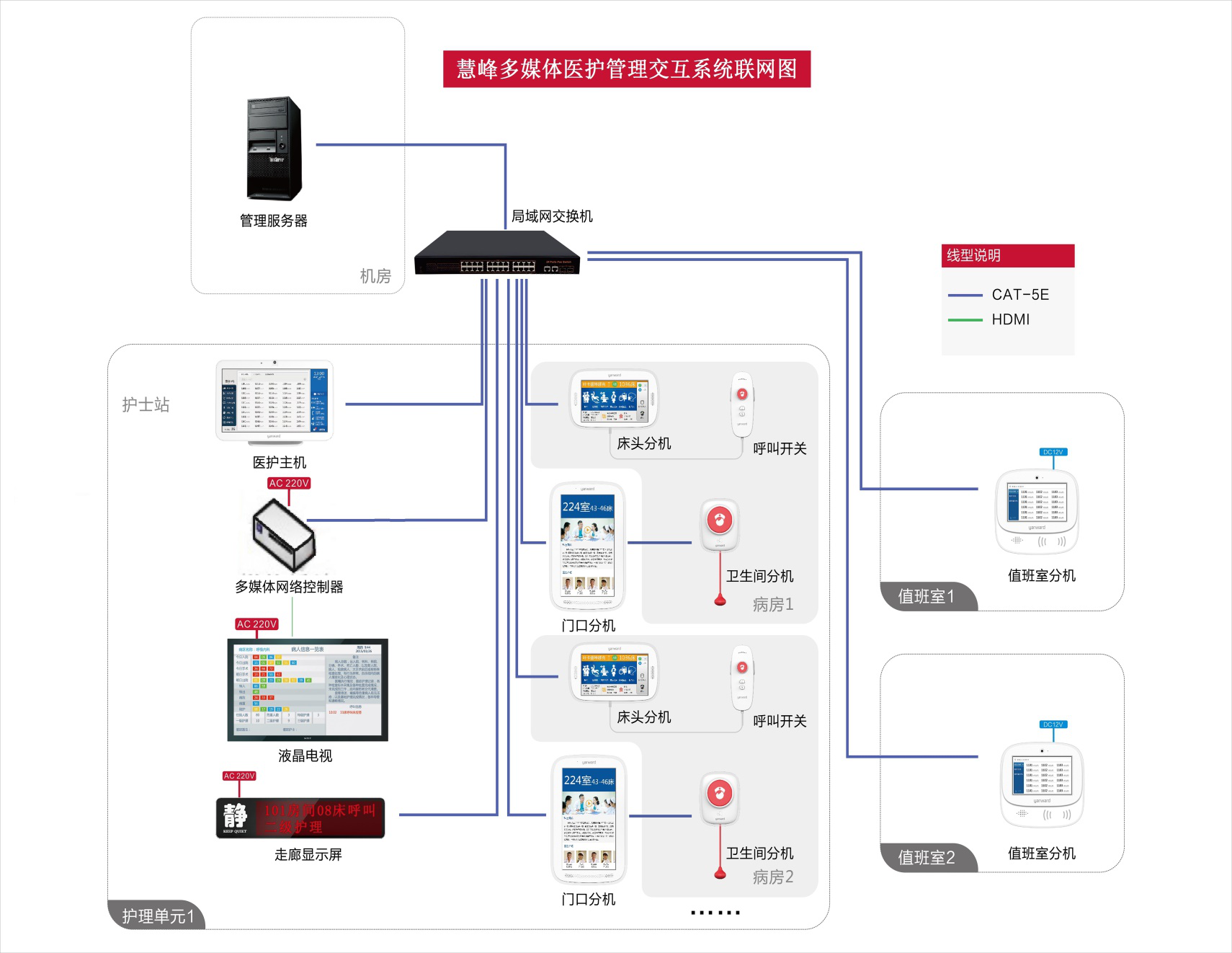 慧峰信息化醫(yī)護(hù)管理通訊系統(tǒng)堅持“以人為本”的設(shè)計理念,以醫(yī)、護(hù)、 患為中心,突破傳統(tǒng)呼叫概念,是面向智能病房呼叫和臨床信息管理兩大體系,推出的 數(shù)字化醫(yī)院呼叫系統(tǒng)完整解決方案。該方案覆蓋了數(shù)字化病房建設(shè)的各個環(huán)節(jié),支持智 能呼叫、信息發(fā)布、可視門禁、護(hù)理標(biāo)識、護(hù)理管理和統(tǒng)計分析等功能,實(shí)現(xiàn)了與醫(yī)院 信息管理系統(tǒng)(HIS)無縫連接,對加強(qiáng)病房管理,減輕工作強(qiáng)度,提高護(hù)理質(zhì)量,增 加患者滿意度具有重要意義。。